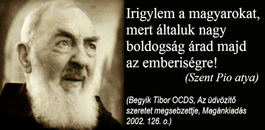 Egy alkalommal állítólag azt nyilatkozta Szent Pio atyánk, hogy „irigyli a magyarokat, mert általuk nagy boldogság árad majd az emberiségre!" Mástól még azt is hallottam, miszerint „kevés nemzetnek van olyan nagyhatalmú őrangyala, mint a magyaroknak s bizony helyes lenne fokozottabban kérniük hathatós oltalmát országukra!” ‒ Nem hihetetlen, vagy mégis?!